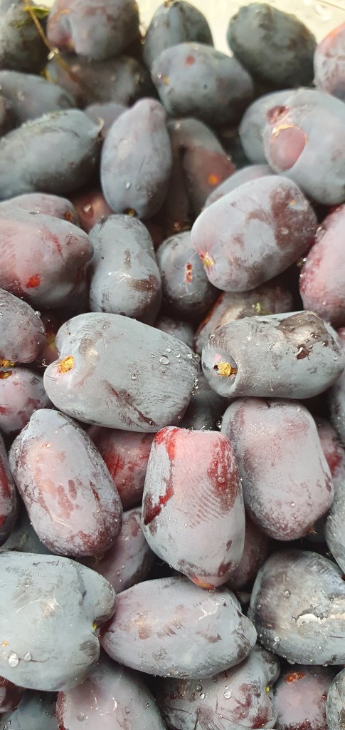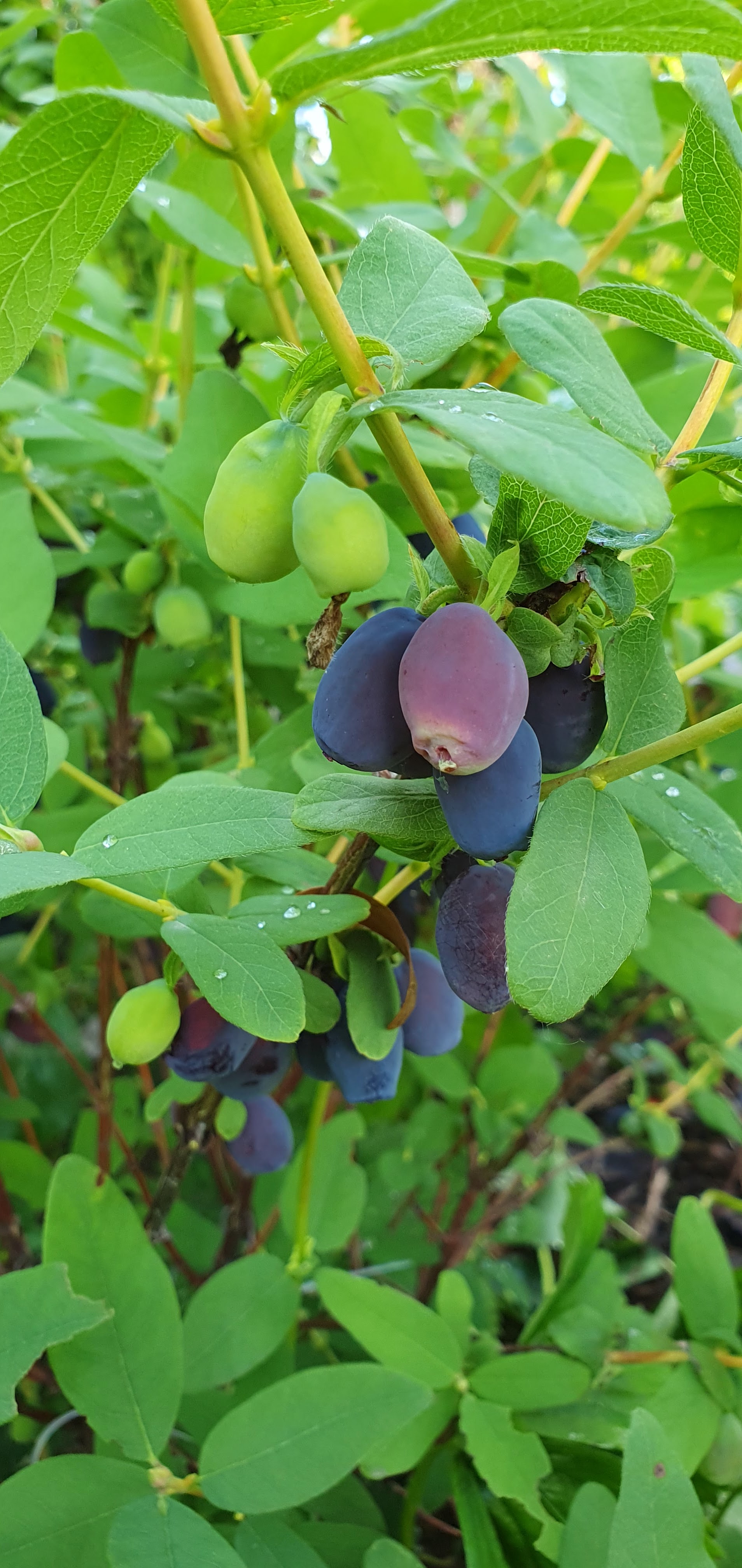 Les baies de camerisier sont allongées, de couleur bleu foncé à presque noire, et ont une peau fine recouverte d’une légère pruine. Leur saveur est souvent décrite comme un mélange entre la myrtille, la framboise et le cassis, avec une touche de sucré et d’acidité