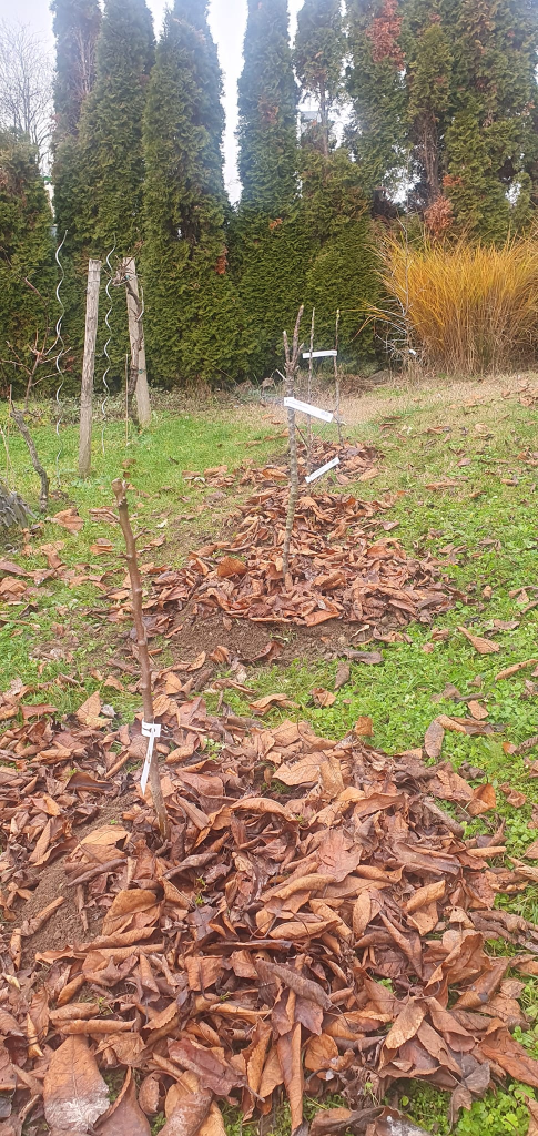 La plantation terminée, j’arrose abondamment puis paille le tour des arbres, ici avec des feuilles mortes du cerisier voisin 🙂