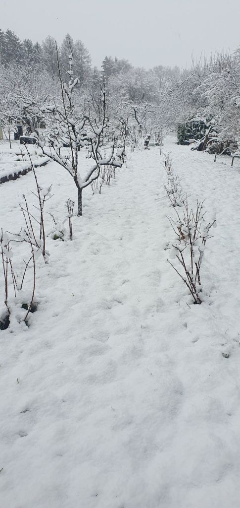 Le verger altitude 520 m se recouvre d’un beau manteau qui va parfaitement isoler nos dernières plantations des rigueurs du froid.